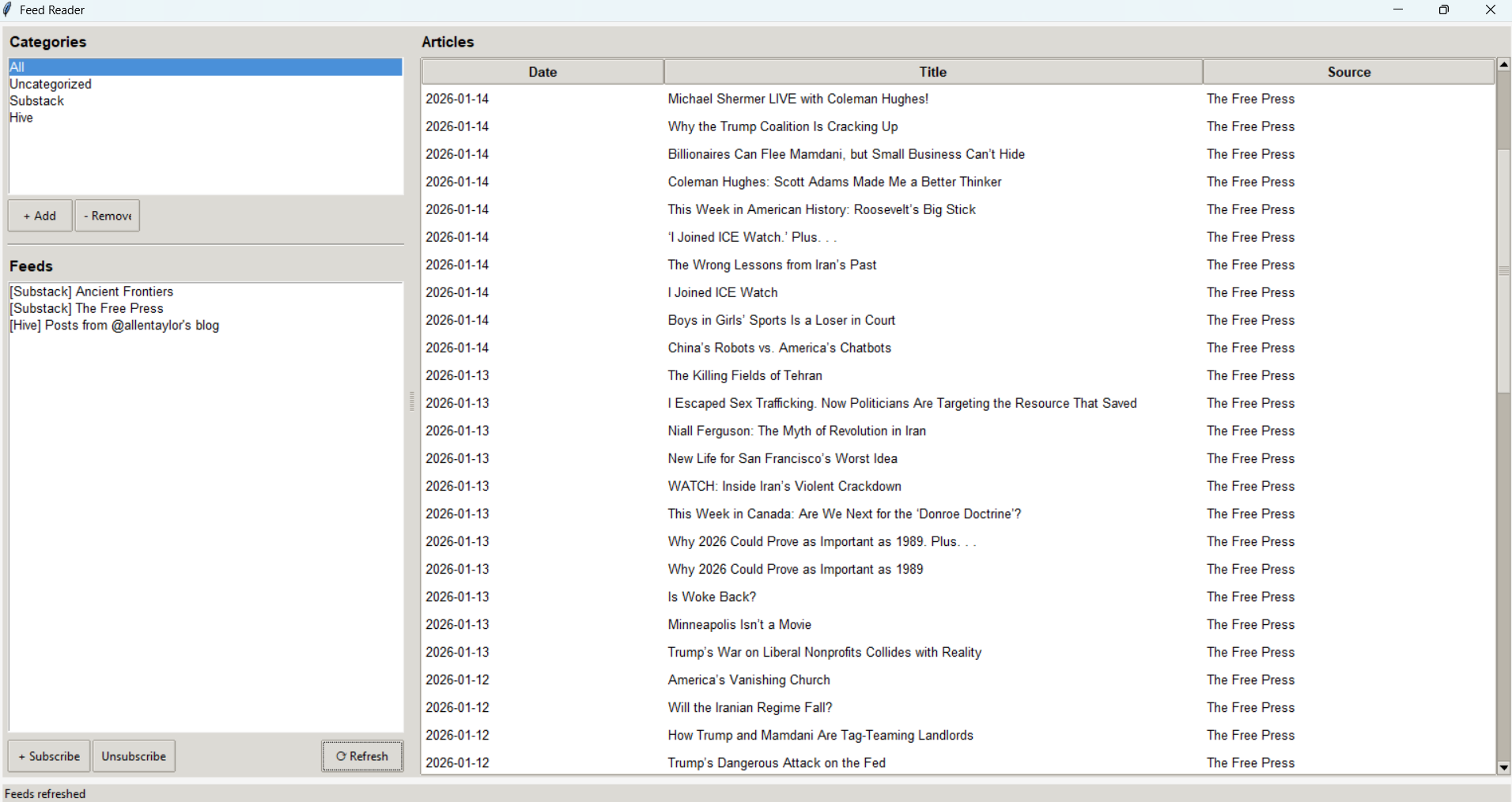 It took me about 20 minutes to tell Claude what I wanted and to talk through a few simple tweaks to get my own personal RSS desktop aggregator. I have yet to populate it with all the content I want to follow, but here’s the simple interface that allows me to add categories, add RSS feeds I want to subscribe to, and easily delete the ones I no longer wish to follow.