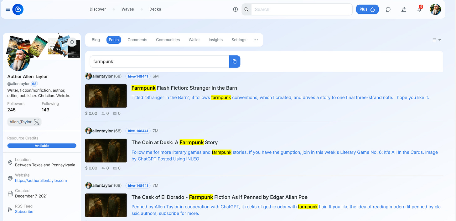 To be fair, each does have its own unique way of organizing a user’s content. InLeo, for instance, does allow users the ability to order Threads (short-form content similar to Twitter) by Latest, Oldest, and Trending. But it has no way of categorizing blog posts. Ecency provides a search bar that allows users to search for content by keyword and filter blog posts for a certain account by that keyword; for example, on my blog, you can search for all the posts related to “farmpunk” and see a fairly good list of posts that reference that keyword. On PeakD, posts can be filtered by a list of tags, but that list is incomplete.